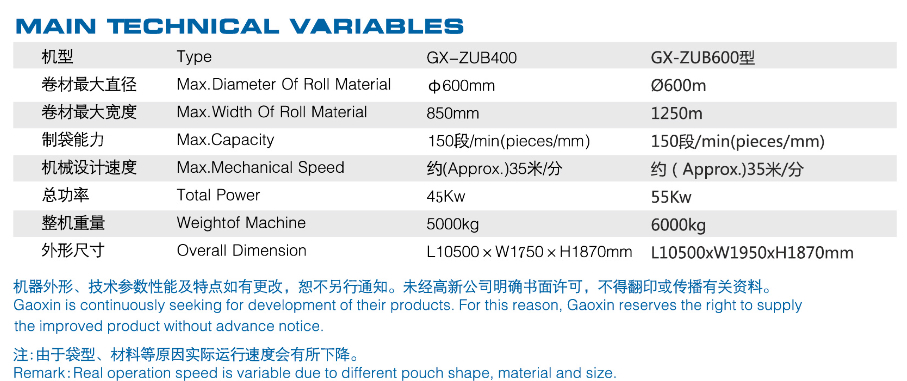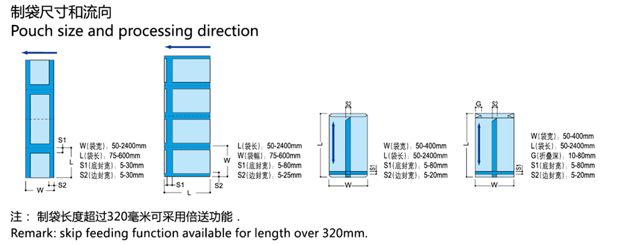 用途 該機結構合理,操作方便,自動化程度高,適用于生產各種塑-塑,紙-塑的已復合材料,是各種中封袋,三邊封的理想制袋設備。 性能及特點 1、整機采用進口PC,人機界面集中控制。性能穩(wěn)定,易于操作、維護。操作界面中、英文可相互切換。 2、所有參數均由人機界面實時顯示,可預置制袋速度,制袋長度,溫度,計數,成品輸送等。 3、LPC自動糾偏,雙光電跟蹤放料,自動恒張力控制交流變頻恒速自動送料。 4、進口雙伺服拖料控制 5、上、下封壓交流變頻電機驅動 6、溫度采用PID調節(jié),0~300℃可調無觸點自動控制,人機界面集中設定。 7、溫度由電腦集中控制。 8、氣動多功能自動沖孔,邊料切除自動收取,具備靜電消除裝置。 9、工作方式:定長制袋,光電跟蹤制袋。 10、沖孔方式:可設置連續(xù),間隔,停止,沖壓時間可預置。 11、倍送方式:一至六倍送。 12、批送功能:工作臺具備批送功能,批送數量可預置。 技術參數: